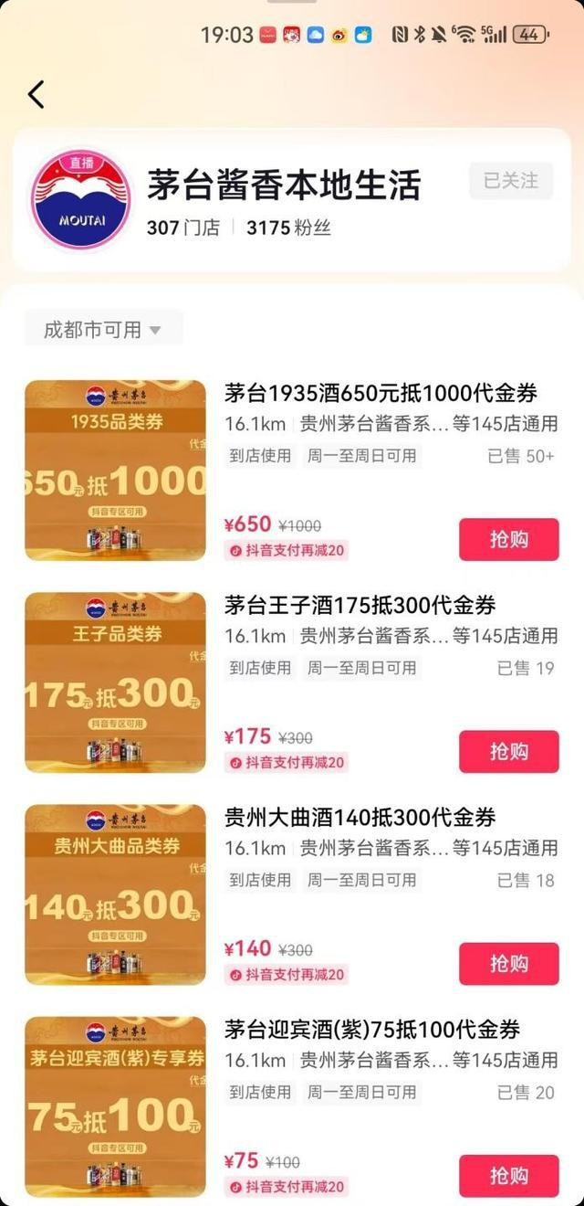 “以前买酒是需要多少钱我们就要掏多少钱,今天在直播间是可以'省上再省'的。”7月17日晚,在茅台酱香酒公司旗下抖音号“茅台酱香本地生活”首场直播中,主播热情洋溢地推销着一种新玩法——核心产品线下门店代金券。